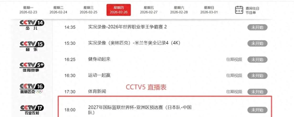 北京时间2月26日,大年初十,中国男篮世预赛火热开打,这场比赛定在日本的主场,根据CCTV5体育频道直播计划表来看。在2月26日18点进行这场比赛的全程直播。