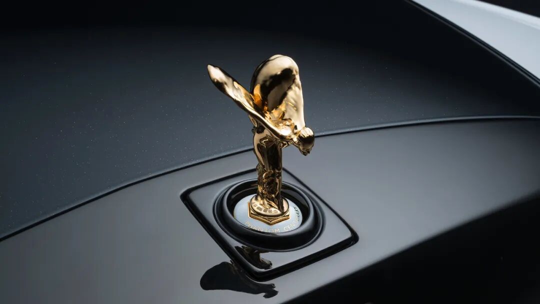 车头矗立着以初代立像为蓝本重塑的“欢庆女神”,以18K黄金铸造并覆以24K纯金镀层,底座采用手工浇铸的白色玻璃珐琅,镌刻专属印记并获伦敦印记及鉴定办公室认证。全新设计的幻影碟式轮毂镶嵌25个同心圆线条,四轮共计百道圆环,暗合限量25台与百年华诞的双重寓意。