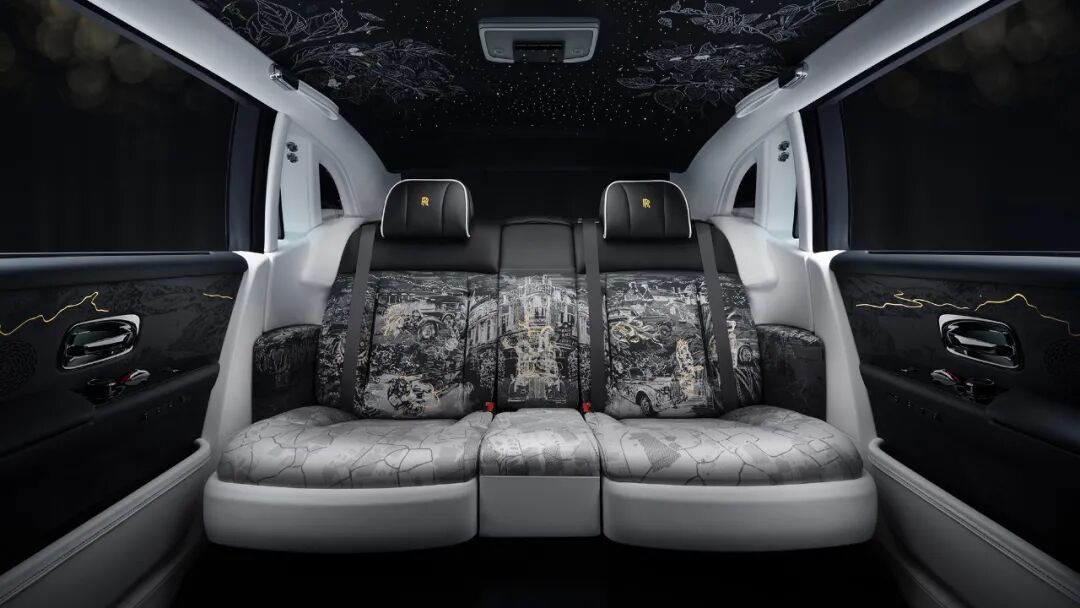 发动机罩极地白涂装点缀24K黄金细节,致敬6.75升V12发动机的卓越性能。星光顶篷以44万针刺绣再现历史场景,包括创始人与同事在桑树下的重要会晤。Bespoke高级定制色彩与材质设计师Katrin Lehmann表示:“为了创作这幅交织着幻影众多故事线索的画作,我们查阅了范围极广的参考资料,同时专门研发了全新工艺技术,包括立体层叠着墨工艺,使我们能够增添以往无法实现的微小细节。”
