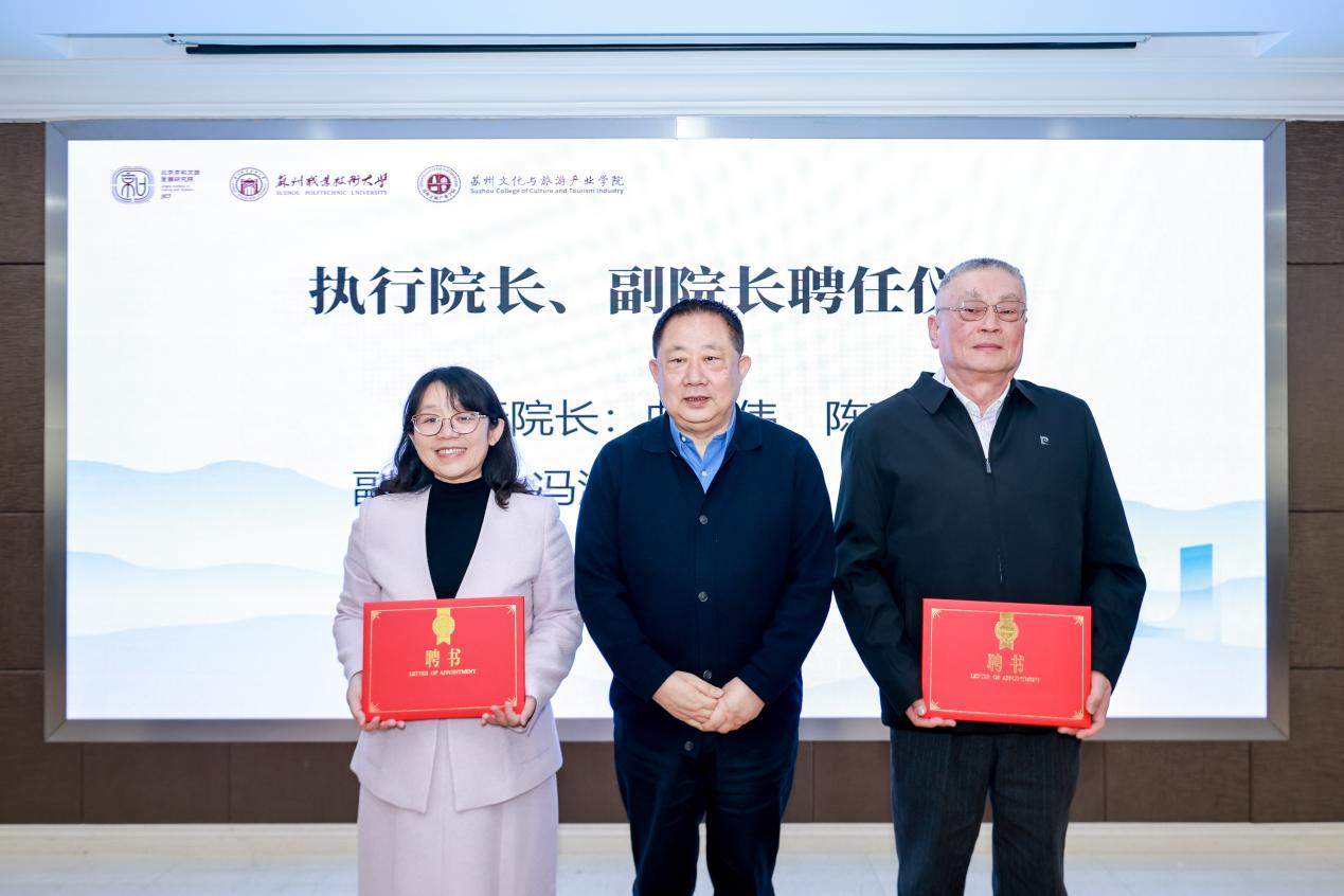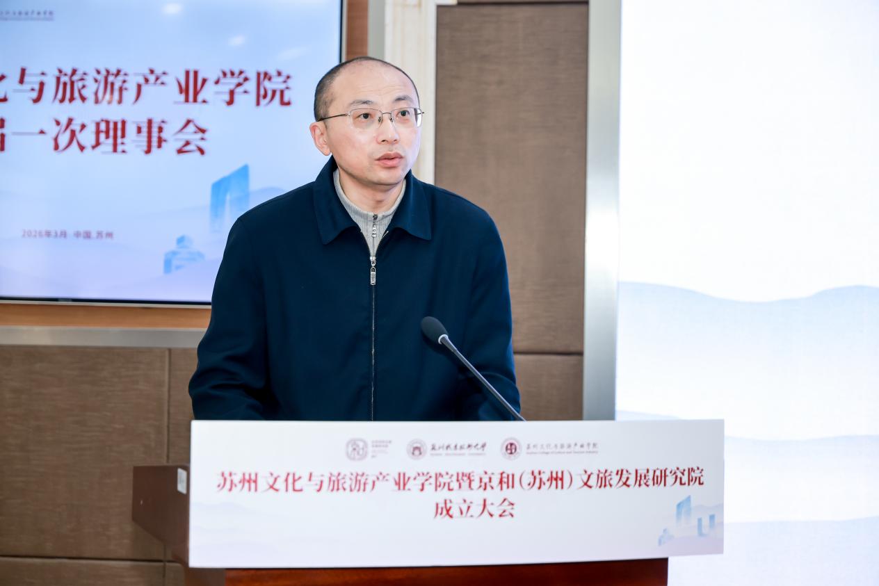 该学院在苏州市委宣传部、市社科联、市文广旅局指导下,由北京京和文旅发展研究院、苏州市旅游文化产业协会、苏州职业技术大学携手苏州博物馆、高新旅游产业集团等数十家苏州骨干文旅企事业单位联合组建、资源共享,以“构筑校企命运共同体”为宗旨,深度对接苏州十大板块文旅产业布局,紧扣苏州文旅数字化转型与江南文化活化利用趋势,聚焦文旅智慧管理、文化遗产活化、文创IP开发、非遗技艺传承等方向开展人才培养,全力破解文旅人才供需结构性矛盾,构建苏州文旅政产学研用协同发展新生态。当天,理事会审议通过产业学院章程,选举产生了理事长单位、副理事长单位及运营团队,并举行了产业学院共建签约仪式。同时,邀请20余位国内文旅领域知名专家、领军人才组成学术研究团队,提供智力支撑。成立大会上,苏州职业技术大学党委委员、副校长张军等领导先后发言提出建设要求,并启动苏州文化与旅游产业学院及京和(苏州)文旅发展研究院揭牌、专家聘任、管理团队聘任及生产性实训基地建设仪式。