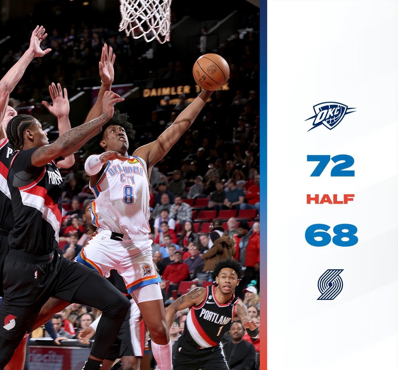 次节上来,曼恩携手吉迪打出5-0攻击波,直接反超领先开拓者3分,沃克、夏普回应4分拿回1分领先,以赛亚-乔命中3分,夏普与西蒙斯回应5-0攻击波,奥莫鲁伊命中2分,格兰特连得5分,杰伦-威廉姆斯3分止血,利特尔与格兰特打出7-0攻击波,分差被拉开到10分,多尔特、亚历山大、杰威连续得手,雷霆在第二节还剩3分40秒时将分差抹平,节末多尔特连续得手,半场战罢,雷霆72-68反而领先开拓者4分进入中场休息。