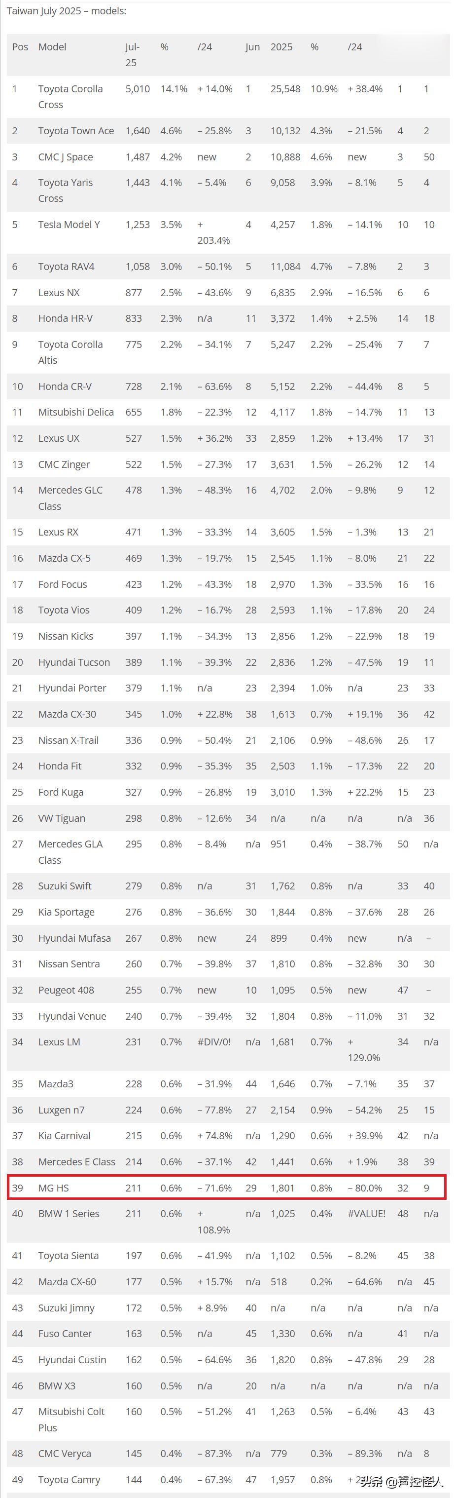 上汽名爵前年进入台湾市场后市占率节节攀升,后来台湾当局以本地化率不够为借口,设置人为障碍,使得上汽名爵销售一度受阻,直到现在也没看到好转的迹象。去年,MG HS这款车型还能排到第9,而到了2025年7月,已经后退到39名了。