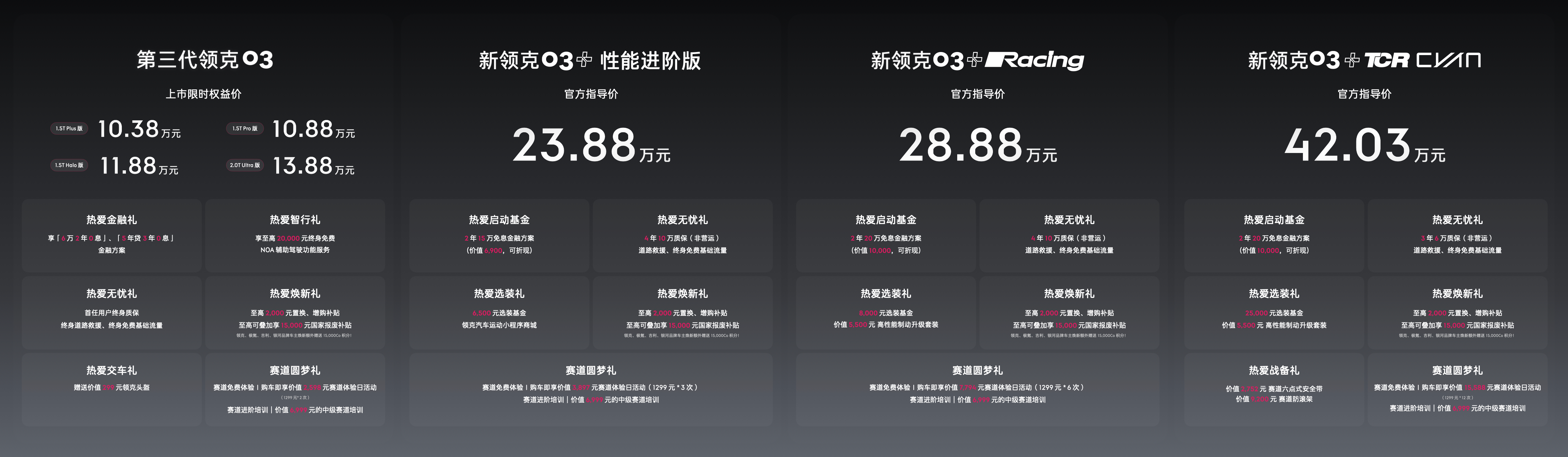 12月购车专属福利进一步降低了复合用车需求的门槛,第三代领克03限时权益价10.38万元起,10000元购置税补贴、5000元保险补贴、3000元加油现金补贴,直接减少购车与日常通勤的开支;6万2年0息、5年贷3年0息的金融方案,可灵活适配不同消费者的经济状况,避免因购车影响生活质量;至高价值2598元的赛道体验日活动与6999元的中级赛道培训,还能让消费者在通勤之余,深入体验性能乐趣。