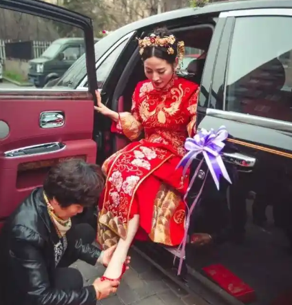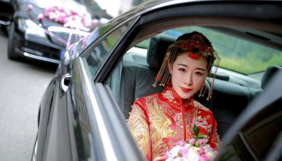 直到车队抵达举办婚礼的酒店门口,按照习俗,新娘该由新郎抱下车。