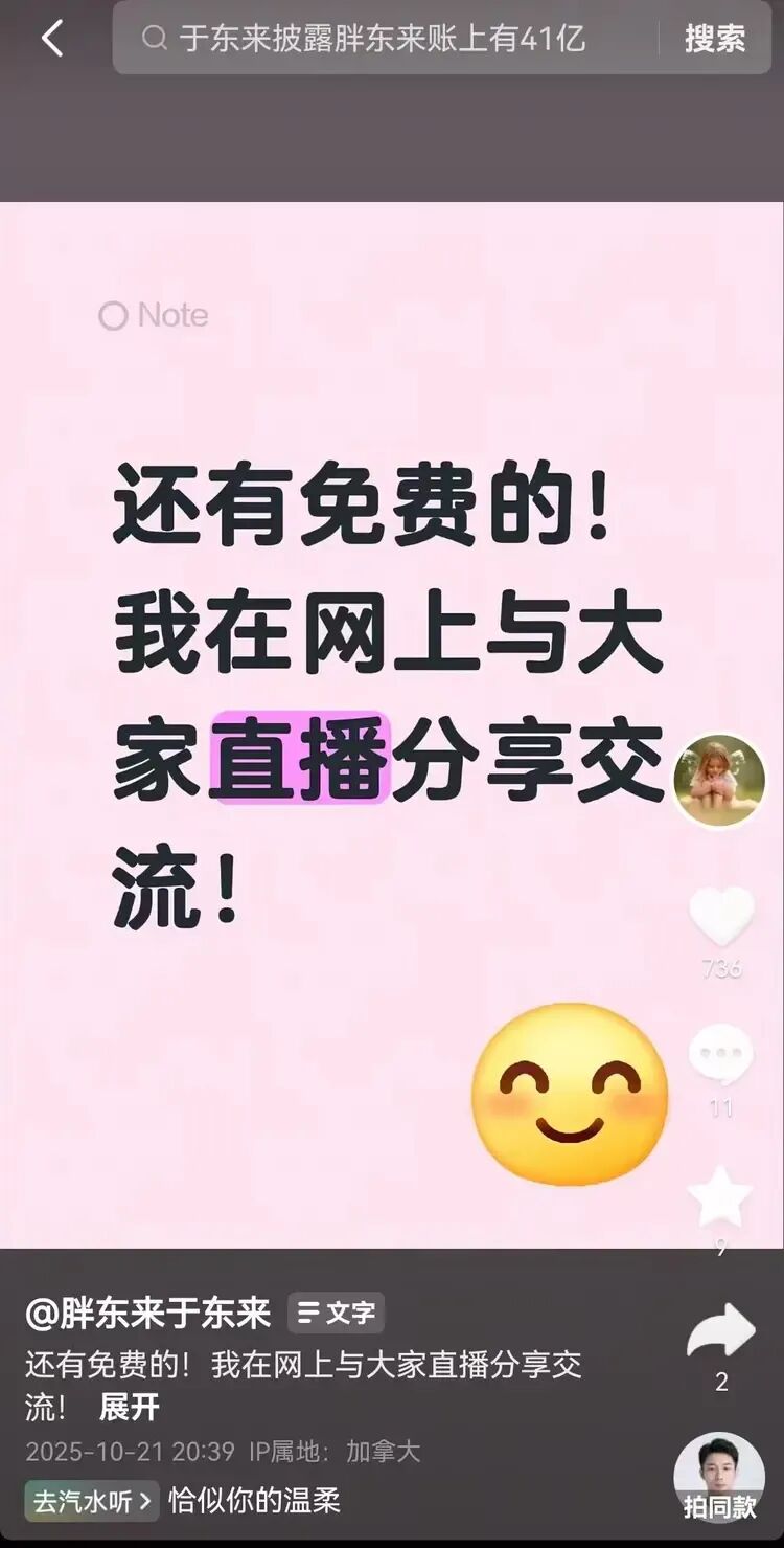 10月21日,于东来在社媒连续发文。于东来称:“为了方便企业家学习,正在规划方案!哪个企业家想让我个人直接分享交流,时间安排三个小时左右,每次五十万元费用!每月最多一次!费用全部用于传播美好之路!”