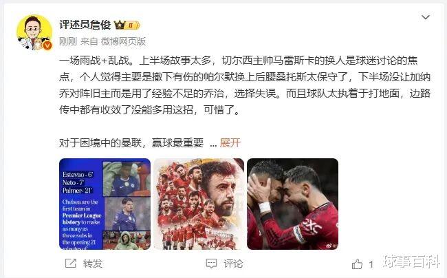 赛后,评述员詹俊发文点评了切尔西的表现。对于马雷斯卡的换人调整,詹俊同样给出了自己的质疑。詹俊表示:一场雨战+乱战。上半场故事太多,切尔西主帅马雷斯卡的换人是球迷讨论的焦点,个人觉得主要是撤下有伤的帕尔默换上后腰桑托斯太保守了,下半场没让加纳乔对阵旧主而是用了经验不足的乔治,选择失误。而且球队太执着于打地面,边路传中都有收效了没能多用这招,可惜了。
