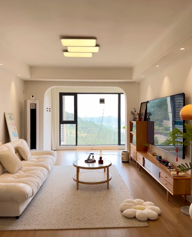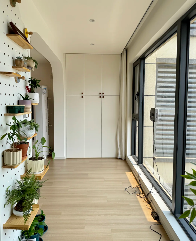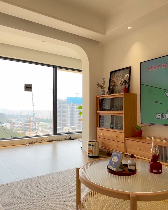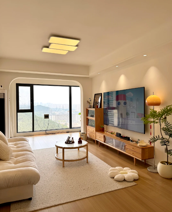 二、氛围感营造秘诀:把温柔藏进每一个细节里 (1)色调统一:奠定温柔基调 想要打造奶油原木风的氛围感,色调统一是关键。家里以大面积的奶油白(墙面、柜门、门窗)和温润原木色(地板、柜体)作为基调,没有加入过多鲜艳的色彩,仅用少量浅色软装点缀,整体视觉上干净、柔和,一进门就能感受到扑面而来的温馨。