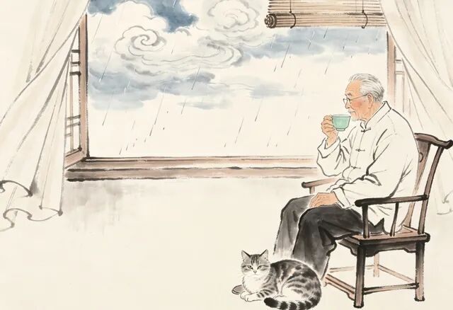 我倚在窗前品茶,