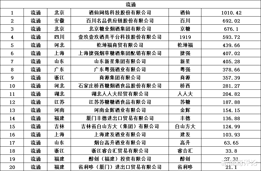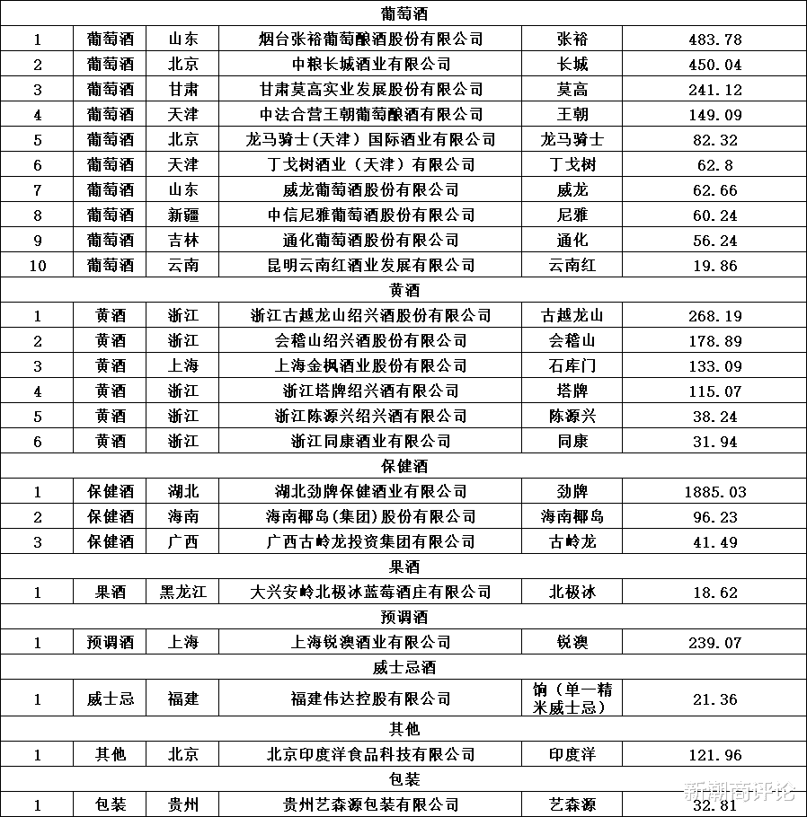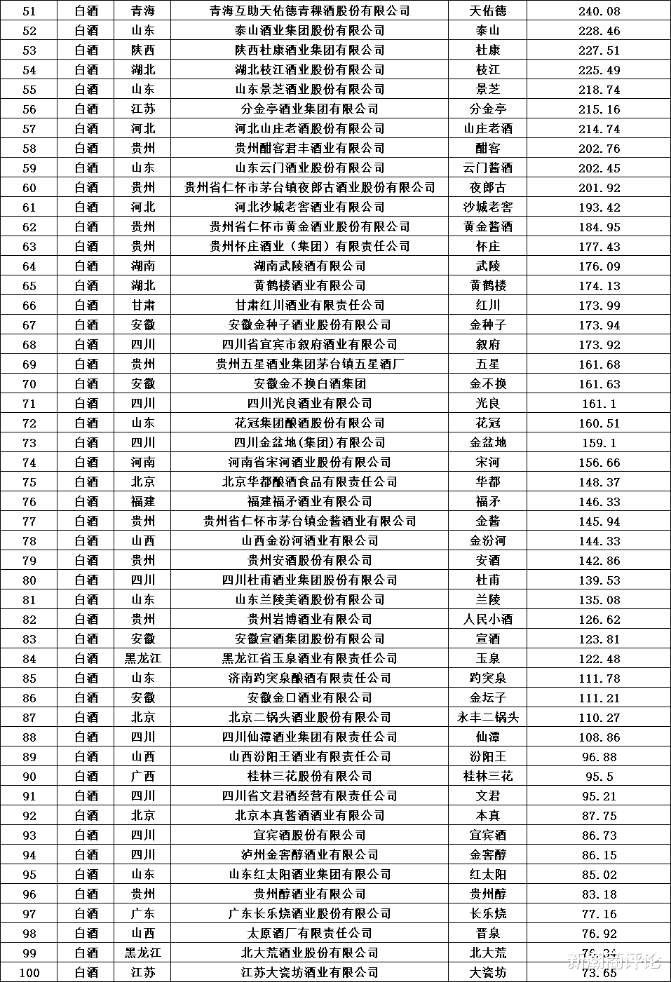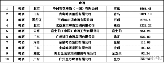 山东位列第三,共有15个品牌上榜,其中白酒10个,包括扳倒井、古贝春、泰山、景芝、云门酱酒、花冠、兰陵等。整体来看,虽然山东“一县一酒厂”,但多而不强,没有一个全国性的知名品牌。葡萄酒、流通各有2个,啤酒1个,张裕(483.78亿元)、青岛啤酒(3021.18亿元)是各自领域的佼佼者。