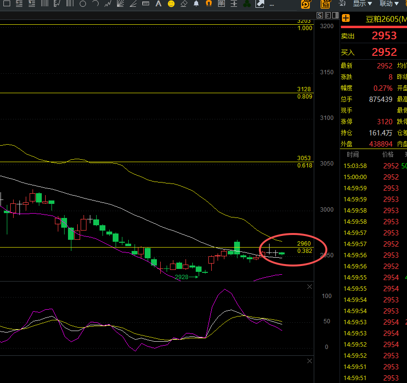 供应:巴西大豆到港量持续增加,油厂开机率小幅回升,库存低位企稳,供应宽松格局边际回暖;美豆走势窄幅震荡,对国内盘面支撑有限,今日豆粕2605合约收盘2952元,较前一交易日上涨8元,涨幅0.27%,最高2969元,最低2934元。