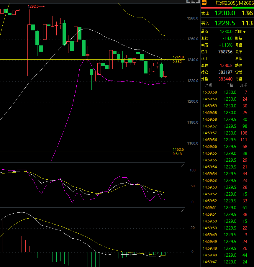 需求:下游钢厂利润微薄,铁水产量回升缓慢,焦企补库意愿低迷,需求端支撑不足,刚需偏弱,难以支撑价格大幅上涨,今日焦煤2605合约收盘1237.3元,较前一交易日下跌14.0元,跌幅1.13%,最高1255.0元,最低1223.0元。