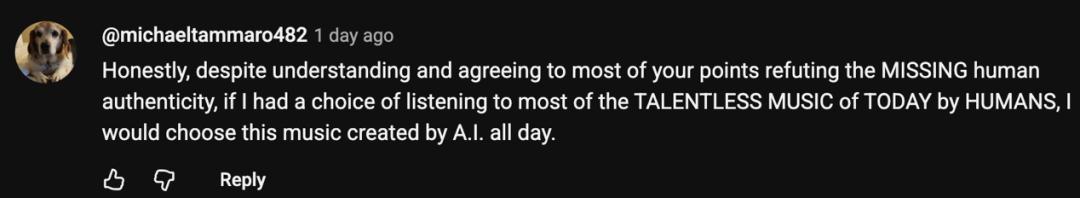 “老实说,虽然理解和赞成大多数人反驳的没有真人感的观点,但如果我可以选择听或不听现在那些没有才华的人类制作的歌,我宁愿选AI制作的歌。”