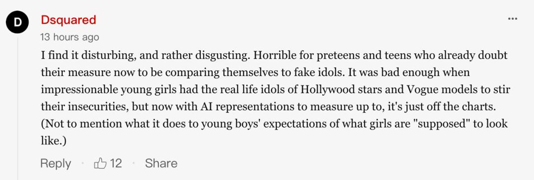 “我觉得这很恼人,可以说很恶心。对于快青春期的孩子和青少年来说,他们现在都已经会和虚拟偶像做身材对比了。年轻的女孩子因为好莱坞明星和时尚杂志的模特感到自卑,现在又要和AI做的虚拟人物比较,太超出常规了。更别提看完这些虚拟模特后,用这个标准期待真实女孩也长这样的年轻男孩子们。”