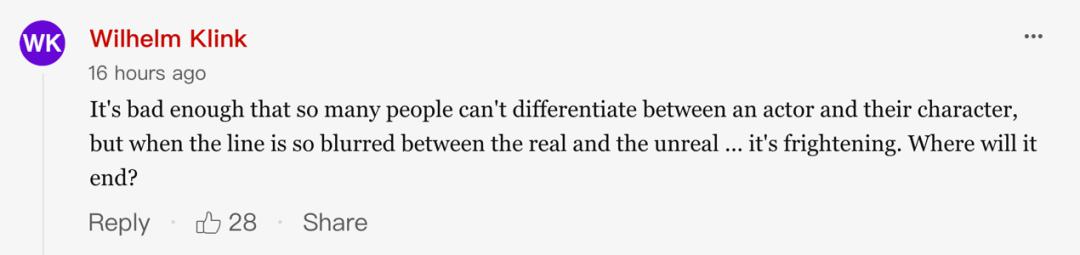 “有人分不清演员和他们所饰演的角色,这已经够糟糕了,现在连真实和虚拟都那么模糊…太可怕了。到底得到什么样子才会结束?”