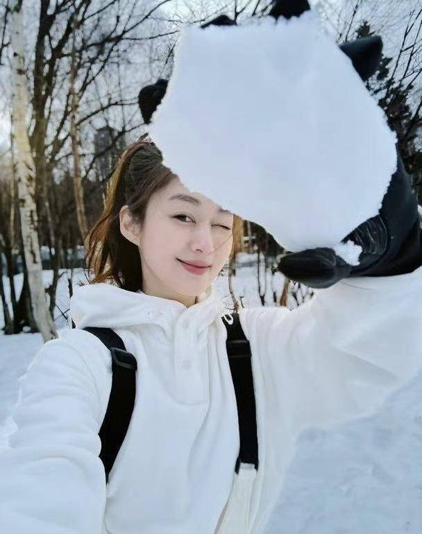 岑丽香置身于一片雪地中,她戴着手套捧起一个大雪球,看起来玩心大发,照片的视角似乎来自她老公,若真是如此,还真的要盛赞一下男方的拍摄技术。