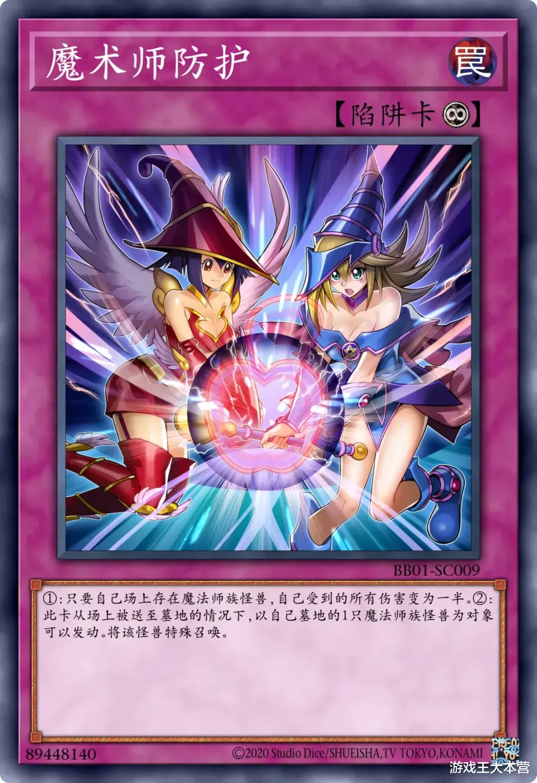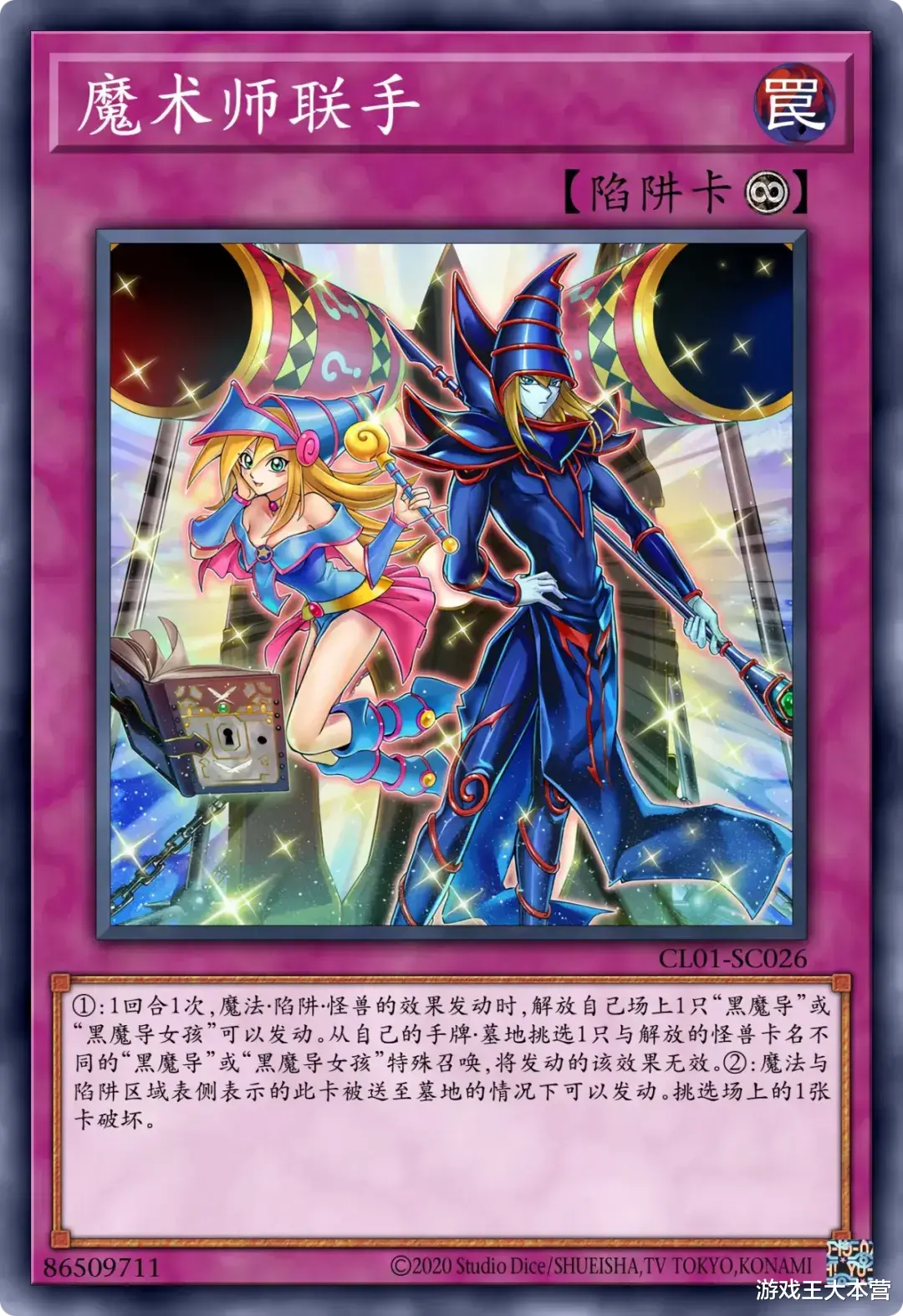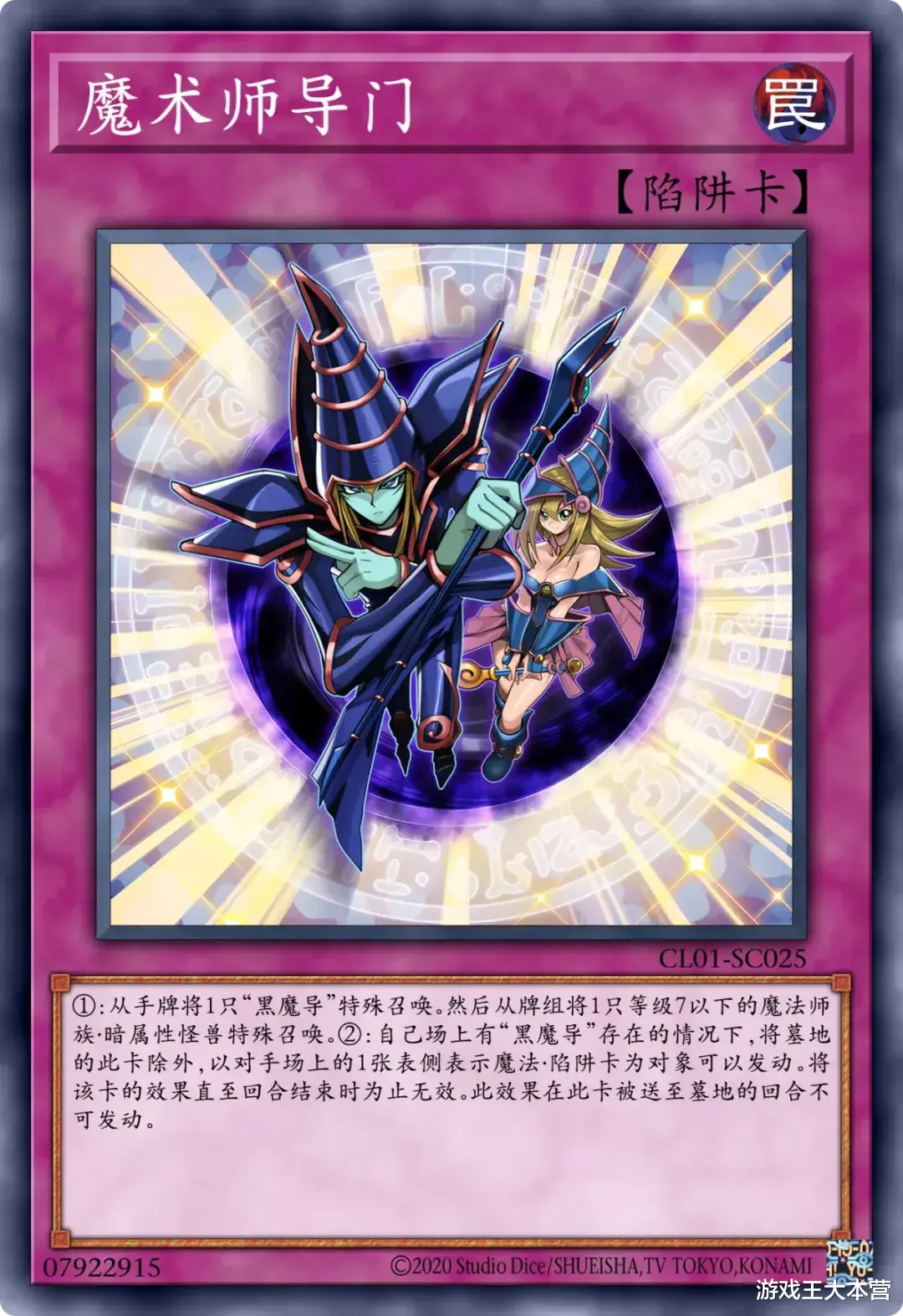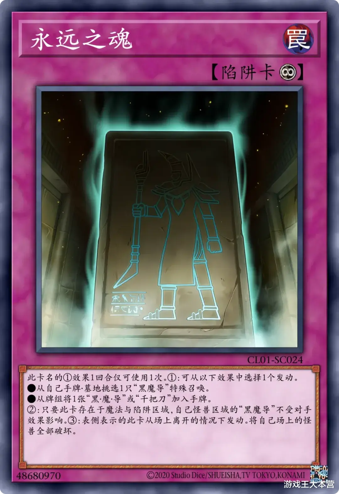 系列魔法卡以「黑魔导阵」为运转核心,兼具检索本家魔法・陷阱与场上破坏效果,同时包含「千把刀」「黑・魔・导」等还原动画咒文的解场卡,陷阱卡则以「永远之魂」为核心保障,可从墓地或手牌特殊召唤黑魔术师,并赋予其效果抗性,离场时还能触发全场破坏,形成攻防一体的站场体系。