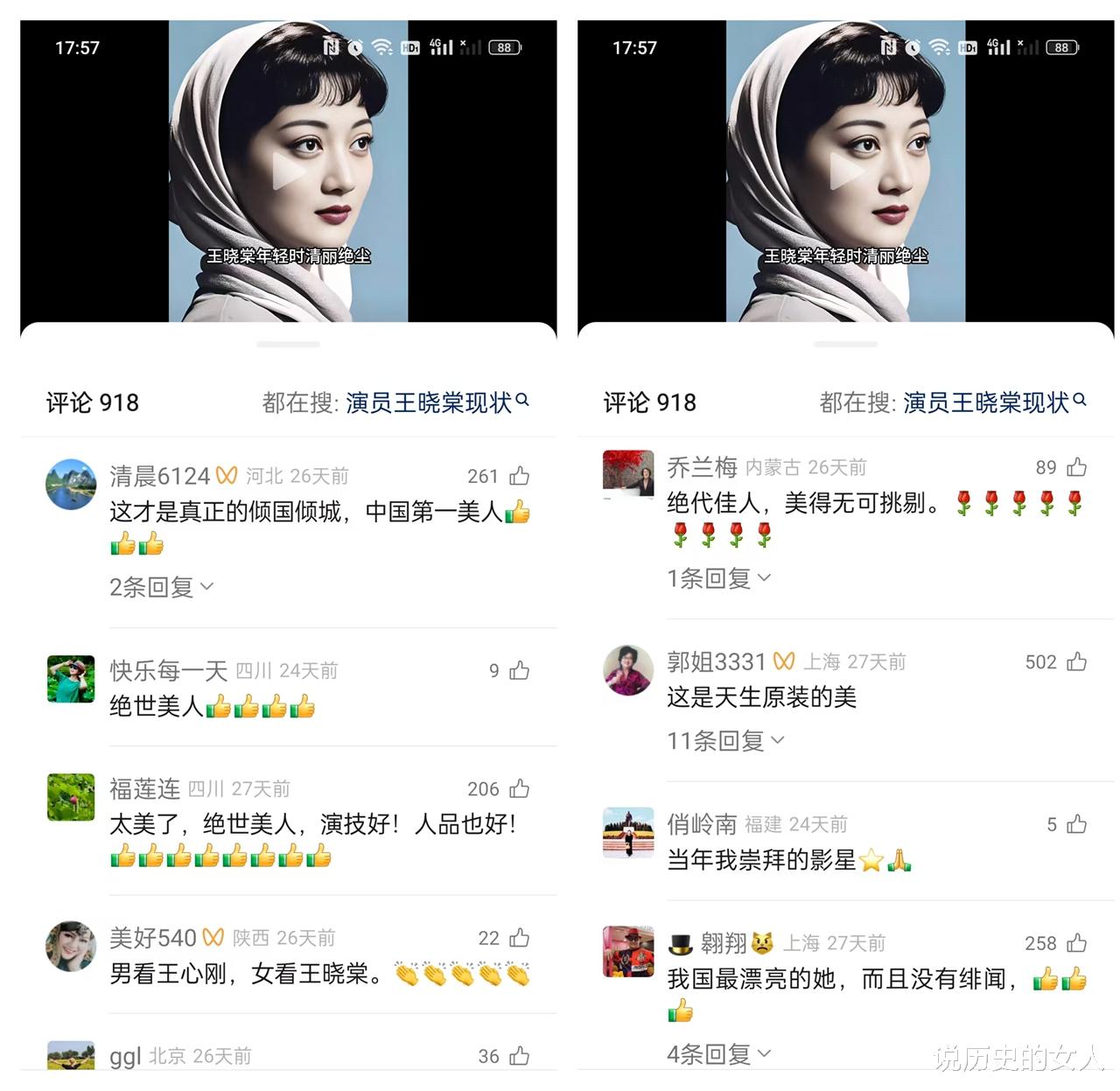 看评论区,近千条评论,大家对王晓棠一致好评,尽是溢美之词,说她是“绝代佳人”、“倾国倾城”、“美得不可方物”、“中国第一美人”等。之前,笔者还从未看到过任何一位女明星被大家如此一致推崇,即便是林青霞、巩俐、刘亦菲也是有的人喜欢,有的人不喜欢。由此可见,王晓棠之美,是真的名不虚传。