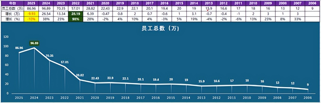 比亚迪员工总数也从2006年年底的9万增加到2025年底的86.96万。换句话说,比亚迪在近20年里,员工总数增加了77.96万人,增加了近八十万人,船夫哥真是个厉害的老板,为近八十万人提供了工作,这近八十万人的房贷、车贷以及老人与小孩的生活费也都有了来源。