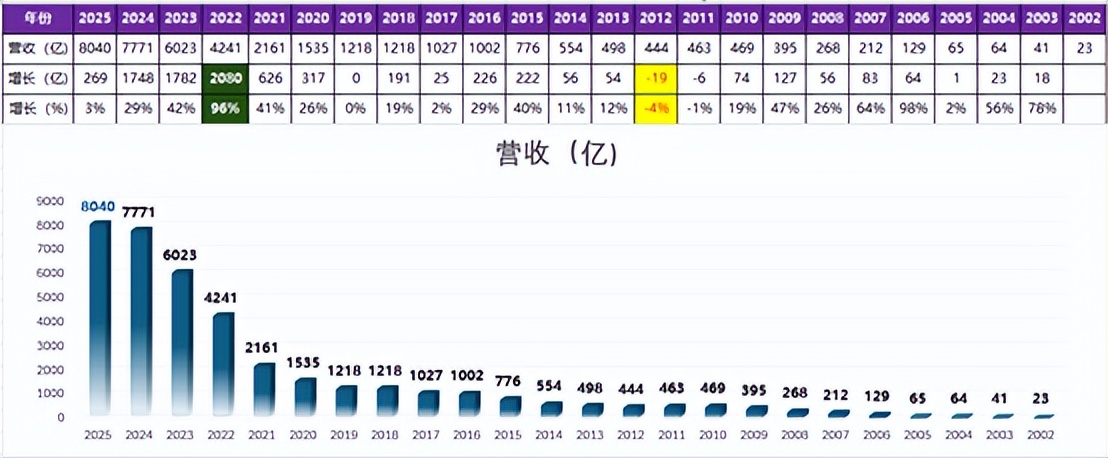 通过梳理比亚迪近23年的营收可以发现,比亚迪在近23年里,其营收增长至2002年的350倍。