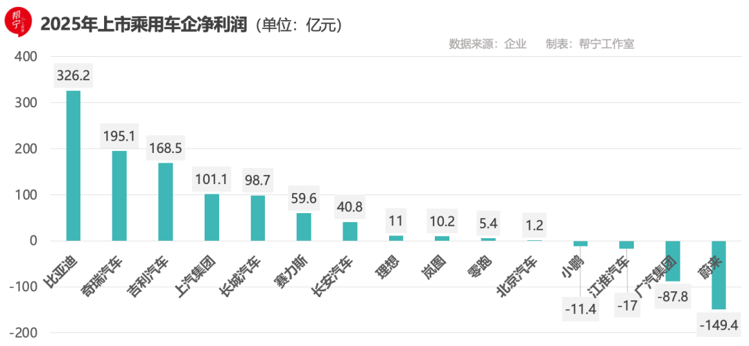 这些吐槽,并非空穴来风,财报数据最能说明问题。据帮宁工作室统计2025年部分乘用车上市车企的财报,盈利车企只有11家,包括比亚迪、上汽集团、吉利汽车、奇瑞汽车、长城汽车、赛力斯、零跑汽车、岚图汽车等。亏损的至少有4家:广汽集团、蔚来、小鹏和江淮汽车。