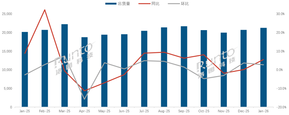 根据洛图科技(RUNTO)发布的《全球电视面板市场出货月度追踪》,2026年1月,全球大尺寸液晶电视面板市场的出货量为21.2M片,同比增长5.5%,环比去年12月增长2.6%;出货面积为15.9M平方米,同比增长5.7%,环比增长1.7%。