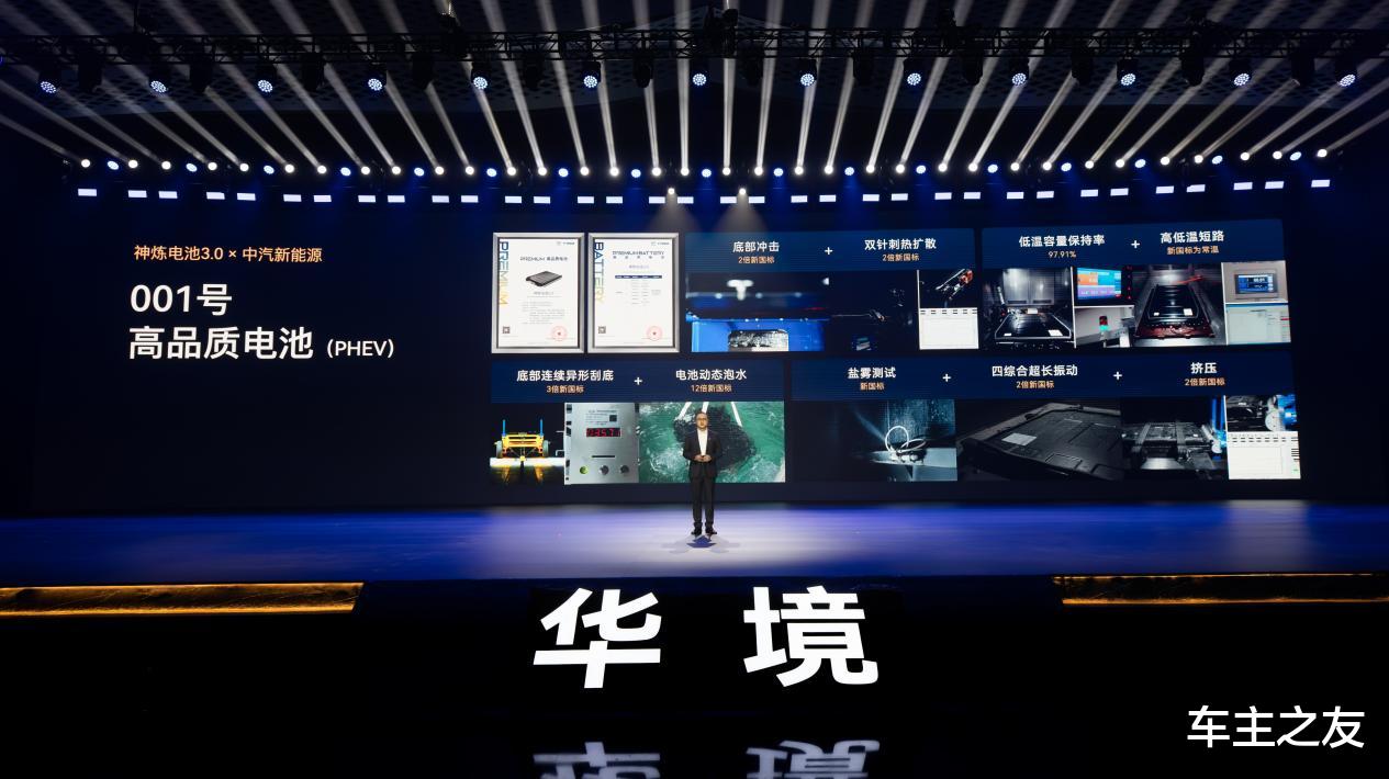 三电安全层面,华境S神炼电池3.0搭载宁德时代超级增·混电芯,打造独有的系统级五“零”安全,达成766亿公里零自燃的实战记录。该电池实现极限设计、极限制造、极限验证三大进化,PPB航空级制造标准,实现十亿分之一的严苛管控,为用户出行保驾护航。在极限验证中,神炼电池3.0不仅以裸电芯硬抗1500J(10倍新国标能量)底部撞击,仍能做到不起火、不爆炸,并通过贴近用户使用场景、超越新国标的四大串行测试,获中汽新能源001号(PHEV)高品质电池验证证书。新国标的四大串行测试,获中汽新能源001号(PHEV)高品质电池验证证书。