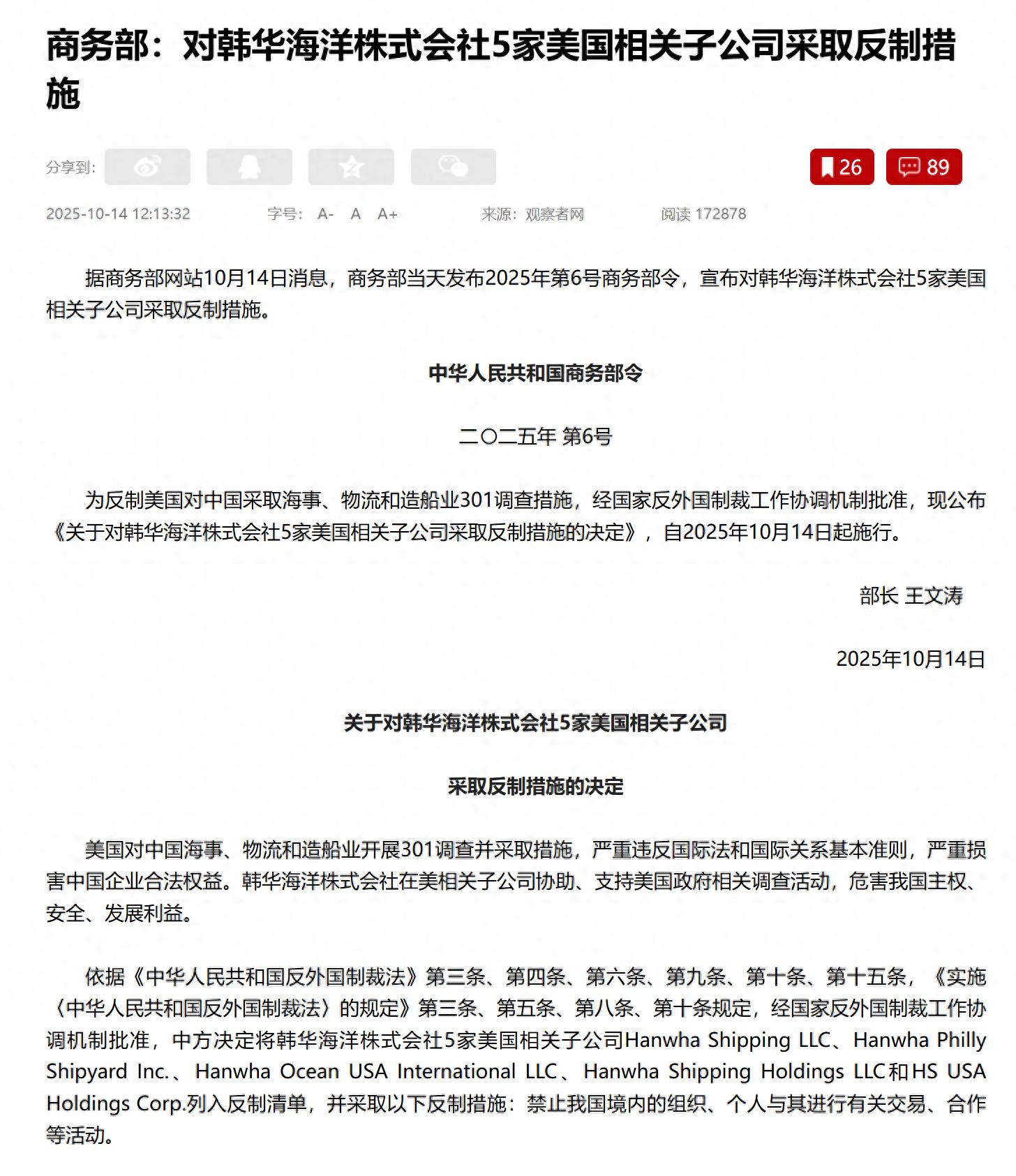 首先,商务部宣布将韩国最大造船企业之一、韩华海洋旗下的5家美企全部拉进黑名单,列入制裁范围。