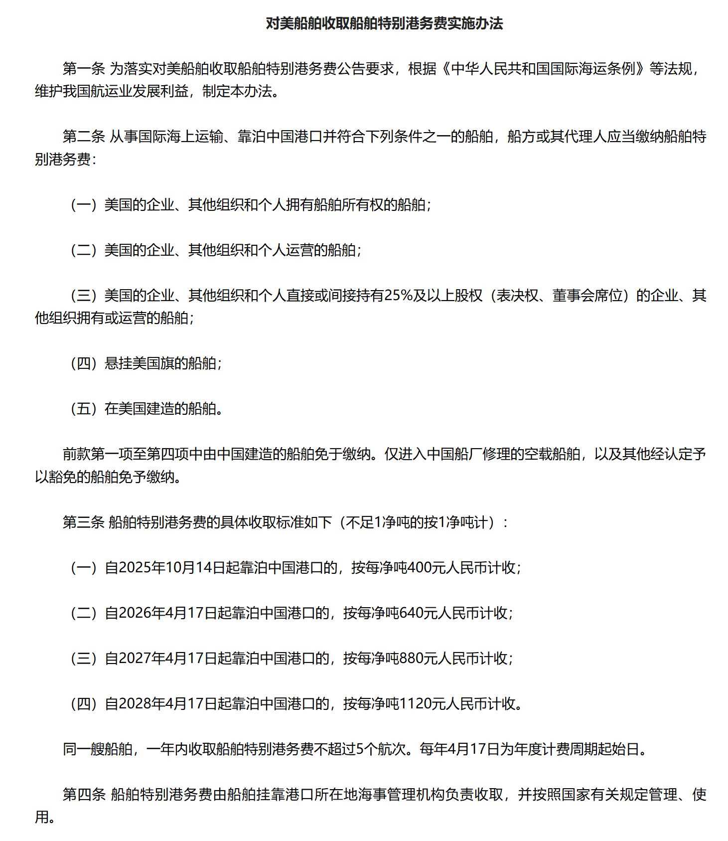 同一天,交通运输部官网也更新通知,即日起对美国企业建造、拥有、运营、持股,乃至挂美国国旗的船舶,按照运载吨位收取对应港务费。
