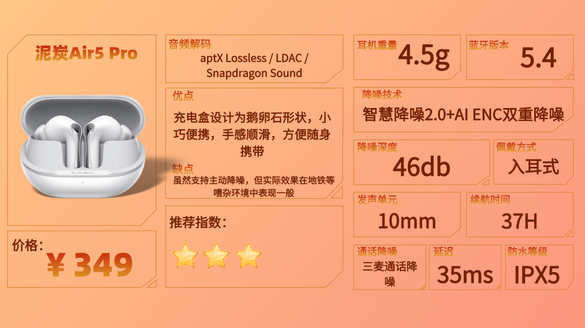在音质方面,它配备10mm复合生物振膜单元,并搭载高通S3芯片,支持aptX无损传输与LDAC解码,还具备Hi-Res小金标认证,整体声音清晰,人声细节表现不错。但低频深度稍欠,重低音爱好者可能会觉得不够过瘾。蓝牙版本为5.4,保证了稳定快速的连接。续航方面单次播放7.5小时,总续航可达37小时,完全能满足高频使用需求。