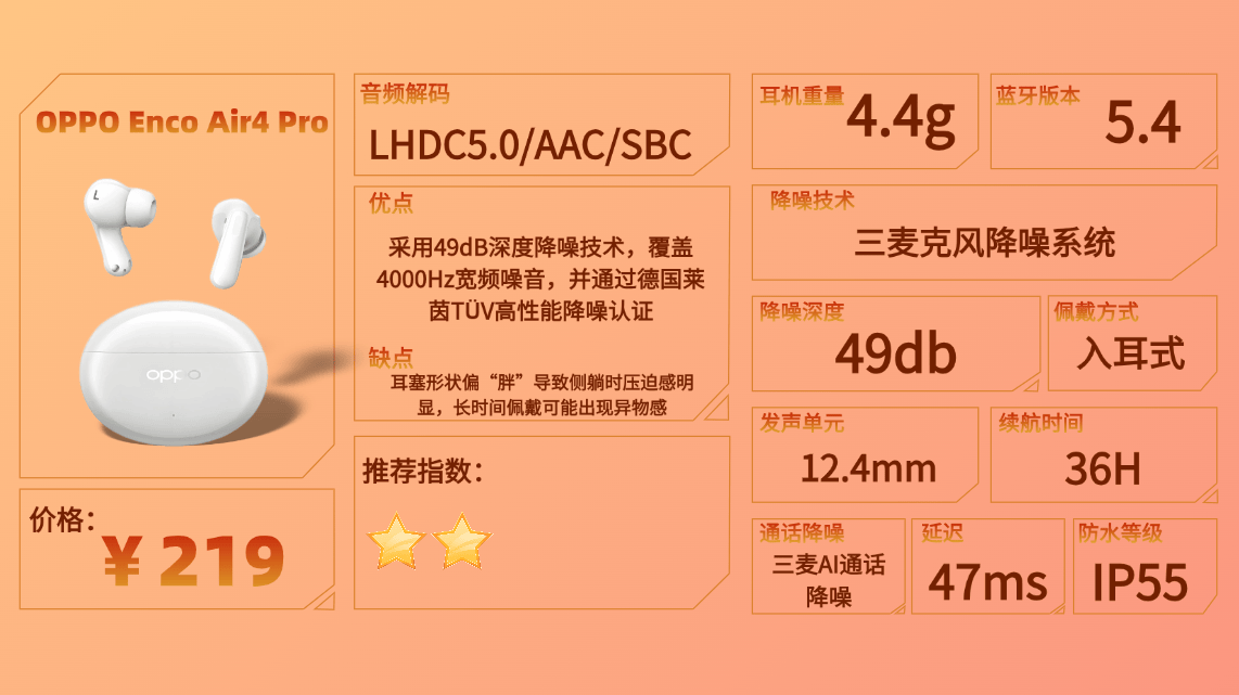 它的音质表现同样有看点,搭载了LHDC 5.0高清音频协议,解析力比AAC强不少,再加上Hi-Res认证以及OPPO金耳朵团队的DeepX立体声效调校,声音在低频和中频表现尤其出色,细节丰富。蓝牙5.4保证了日常连接的稳定性和低延迟,续航方面更是惊喜,单次可用12小时,总续航能达到44小时。但要提醒的是,想体验到LHDC的最佳效果,还需要使用兼容该协议的设备。