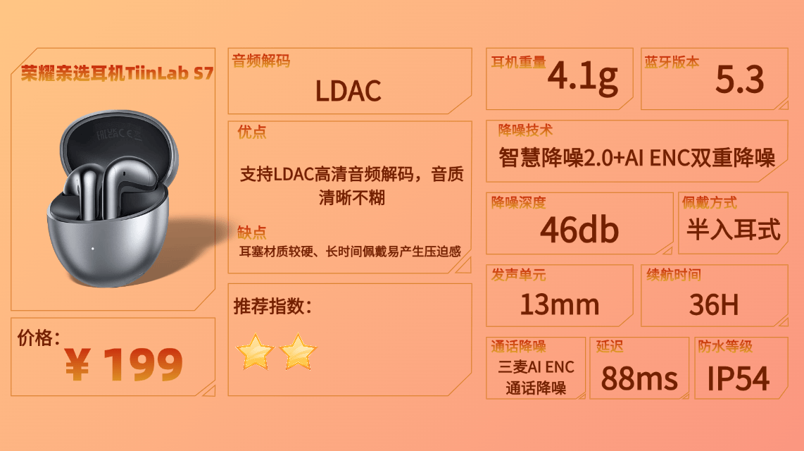 6、荣 耀亲 选耳机TiinLab S7蓝牙耳机