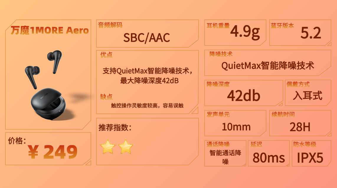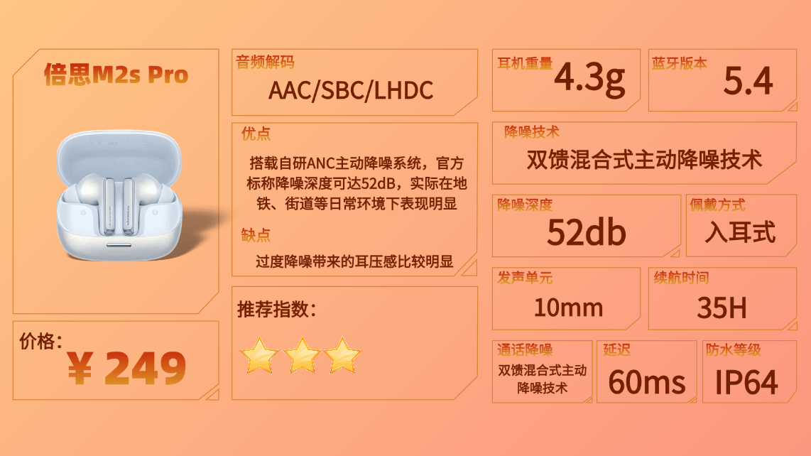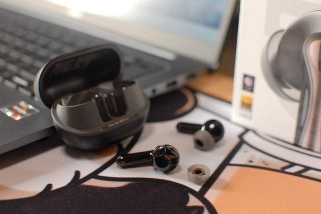 安利理由:这款耳机主打科技潮流感,充电盒采用了滑盖式设计,配备数字屏显和Touch Bar触控条,操作起来直观又有新意,不用依赖App也能切换降噪模式。耳机本体则是30°斜入耳设计,搭配多种尺寸耳套,单只重量约5.5g,佩戴稳固度不错,日常运动时也不容易滑落。