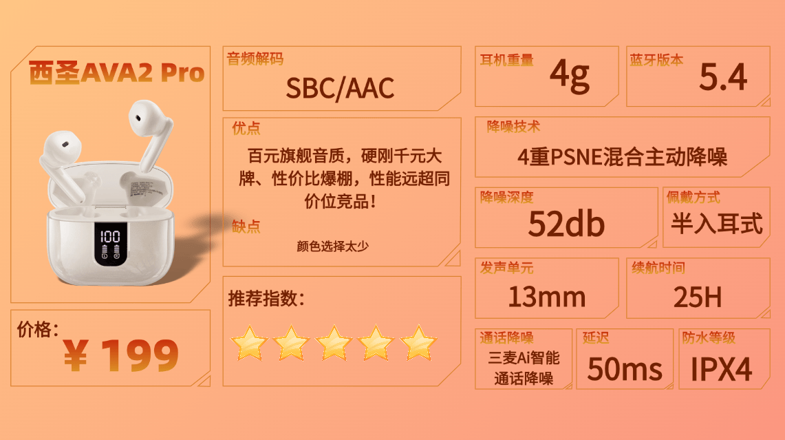 - 西圣AVA2 Pro:专注于音质领域,凭借音质性价比路线收获了众多数码爱好者的用户,百元价格直接体验千元耳机音质效果。