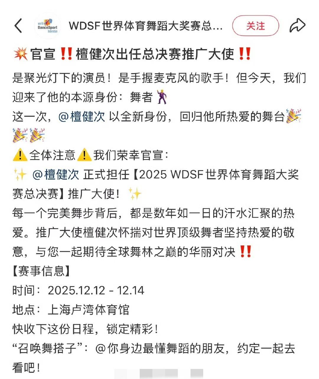 近日,檀健次喜事连连:才出了新歌,又被2025-WDSF国际体育舞蹈大奖赛总决赛选为推广大使,作为专业级舞者,可喜可贺!