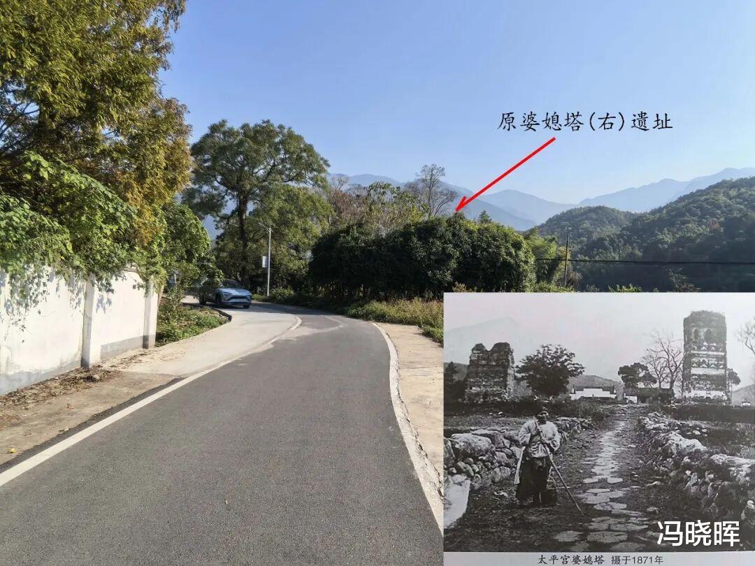 步行从双塔村走到太平村,此处多年前曾数次来过,太平村即太平宫所在地。太平宫为宋朝以来全国有名的道观,留存下来的老建筑原有婆媳塔,老照片中的婆媳塔实为太平宫的钟鼓楼。我曾在文革初期还见过它的身影,文革中毁掉了。太平宫前这条原石板路,是九江通往省城的古驿道上世纪九十年代末还存在,我见过石板上独轮车辗压造成的深车辙。