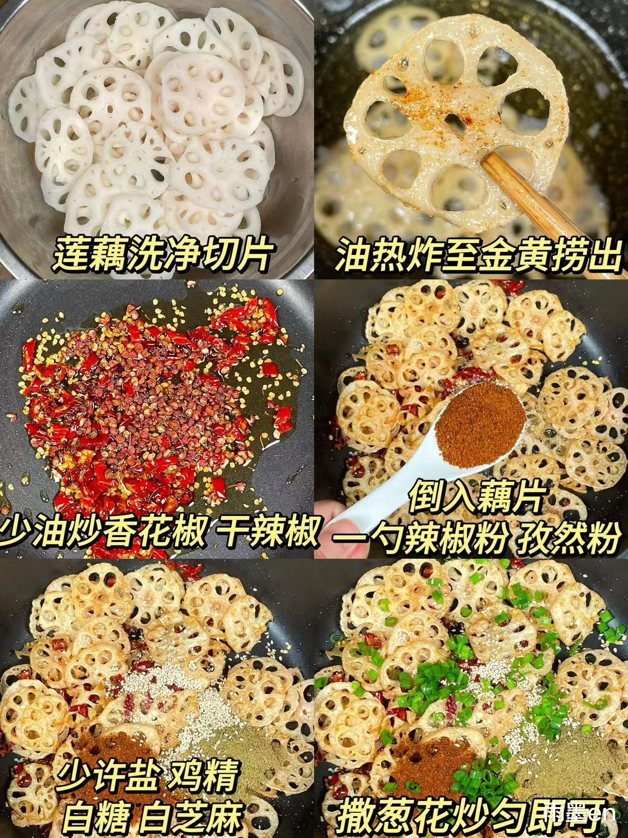 制作这道菜,选藕是关键。需挑九孔莲藕,肉质紧实如玉,切片如薄甲,刀工要利落,厚薄均匀方能煸出脆爽口感。热锅冷油,是烹饪的铁律。藕片入锅,便是一场“火中历练”:中小火慢煸,水汽渐失,边缘卷起焦边,似披上金甲。此时撒入灵魂伴侣——孜然粒与干辣椒碎,铁铲翻动间,西域香料与藕片在热浪中激出火花,麻辣与焦香瞬间爆发。出锅前淋一勺花椒油,咸香麻辣在舌尖炸裂,如同江湖侠客挥剑斩敌,酣畅淋漓。莲藕自古便是“出淤泥而不染”的象征,干煸之法更将其韧性激发,恰如人生:历经淬炼,方能成就风骨。