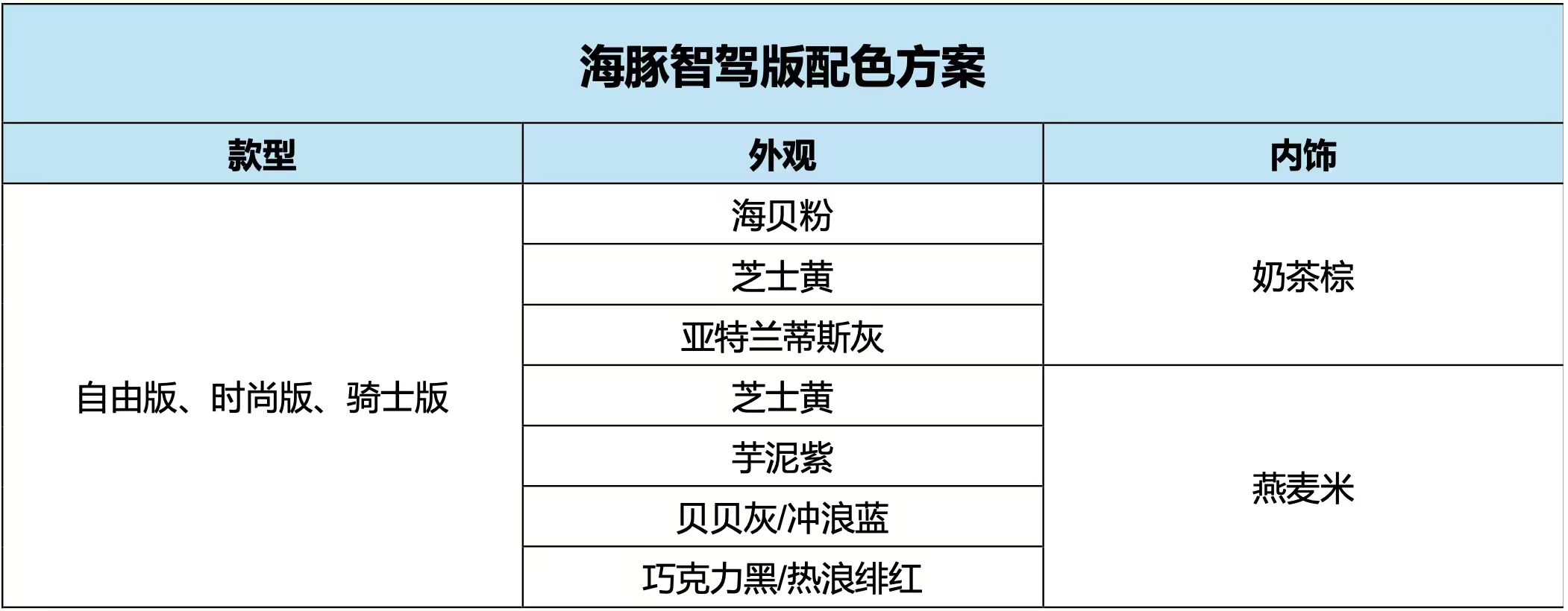 “现象级爆款”比亚迪海豚凭借标杆级产品优势和高颜值造型,上市四年已赢得90余万车主青睐。除了产品物有所值之外,活泼的配色方案也让很多车主一眼爱上。随着汽车消费人群逐渐年轻化,车已不再是单纯的代步工具,更是他们彰显个性、表达自我的载体。因此,大家也期待这款A0级超级精品能够推出更多丰富的色彩。为响应呼声,海豚智驾版在现有配色基础上,加推“贝贝灰/冲浪蓝”“巧克力黑/热浪绯红”2款双色车身、“芋泥紫”纯色车身以及“燕麦米”全新内饰,为生活加点料,让选择更对味!