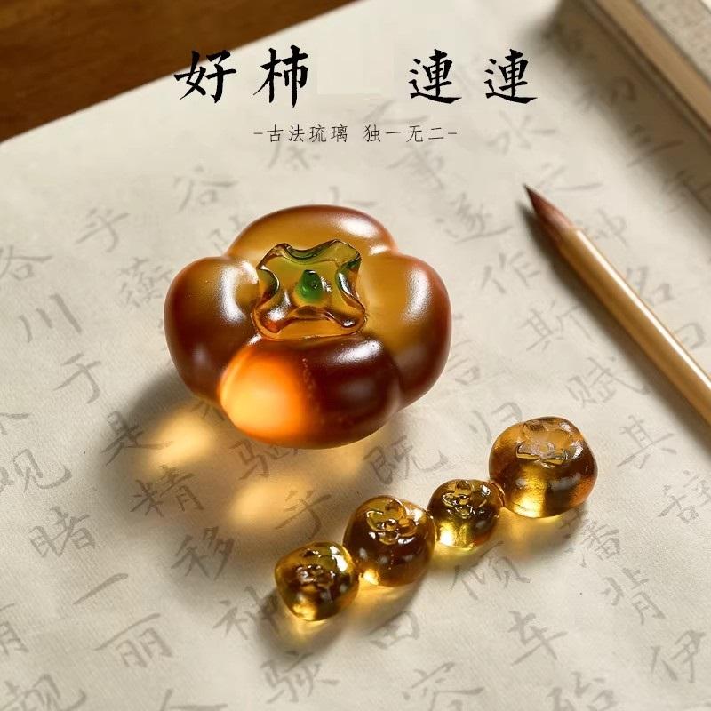 当古法琉璃遇上 “柿柿如意” 笔搁镇纸,一场传统与艺术的盛宴就此展开。古法琉璃,色彩流云漓彩,每一抹颜色都仿佛是自然的馈赠,在光线的折射下,变幻出如梦如幻的光影 ,美得令人窒息。其品质晶莹剔透,毫无杂质,触手生凉,仿佛能感受到千年的时光沉淀。