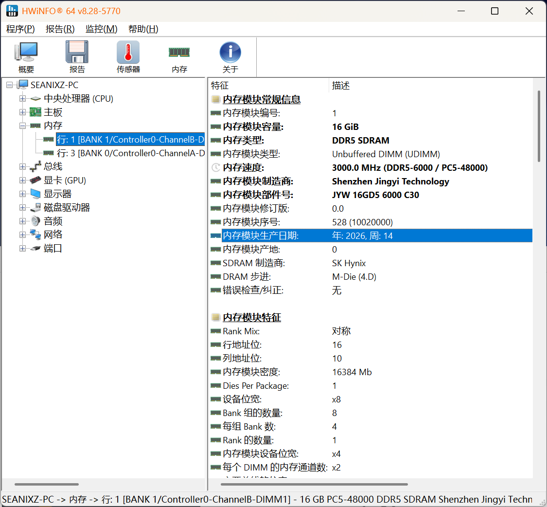 这款内存条最大的亮点在于采用了海力士原厂M-die颗粒,这是目前DDR5领域口碑极佳的高品质颗粒。M-die颗粒在时序表现、耐压性和超频潜力方面都远超普通颗粒,也是许多旗舰级内存产品的同款核心。