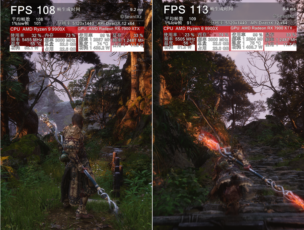 更值得关注的是,在《黑神话:悟空》的复杂场景压力测试中,EXPO一键超频显著提升了1% Low帧的下限稳定性,同时更大幅压缩了帧生成时间波动(Frame Time Variance),使战斗中镜头快速旋转、法术粒子密集爆发等高负载时刻的画面撕裂感几乎消失。