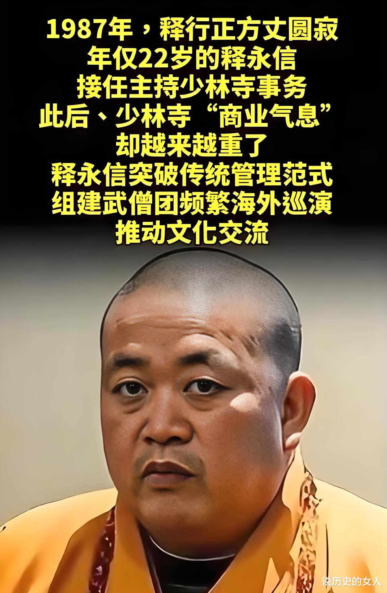 在《少林寺》电影爆火之后,全国各地的人往少林寺旅游、上香。面对贫穷的少林寺,释永信看到了让寺院致富的商机。于是他组建了武僧团到全国到处表演少林功夫,推广了少林寺的“品牌效应”,也赚了不少钱。然后,他又拿钱修缮寺院,为和尚们改善生活,颇得大家拥戴。