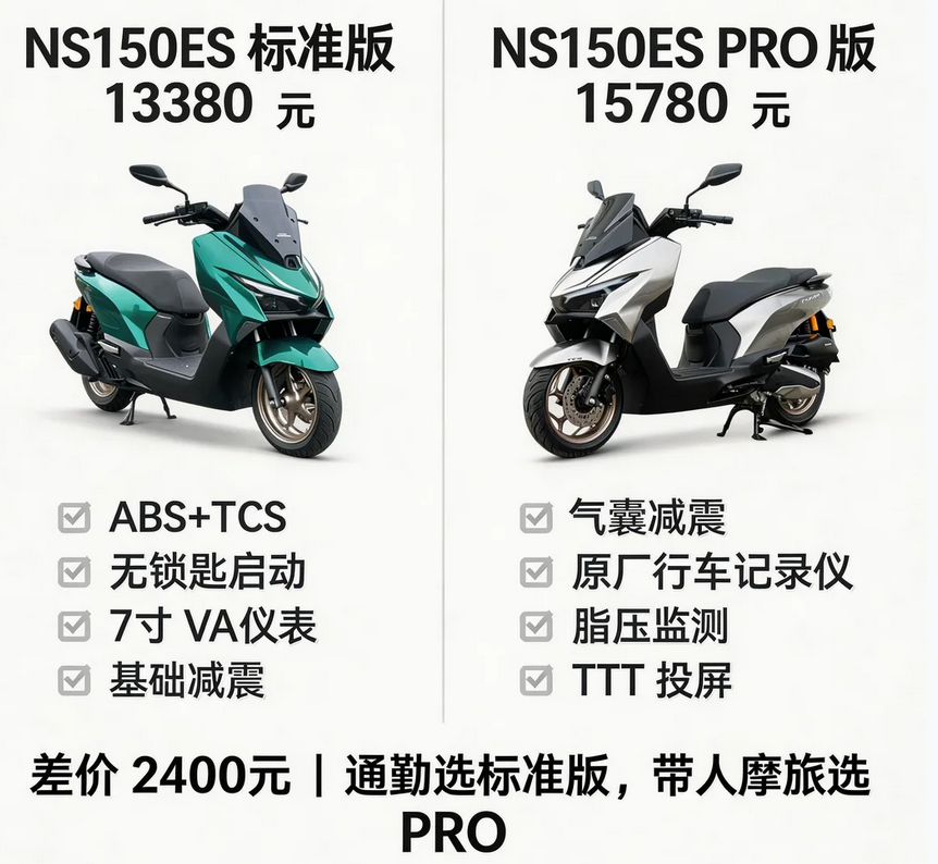 NS150ES分成标准版(13380元)和PRO版(15780元),差价是2400元,动力是一样的, 差别只在于配置上。