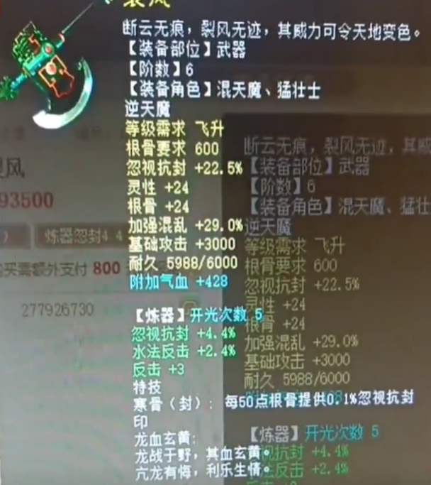现在的仙器价格到底有多低,大家看看这把6阶仙器就知道了。带特技寒骨封,炼器还洗出了忽视冰4.4的高属性。就这样的武器如果放在前两年,没个十几万,你想都别想。现在只能卖9.35万元了。