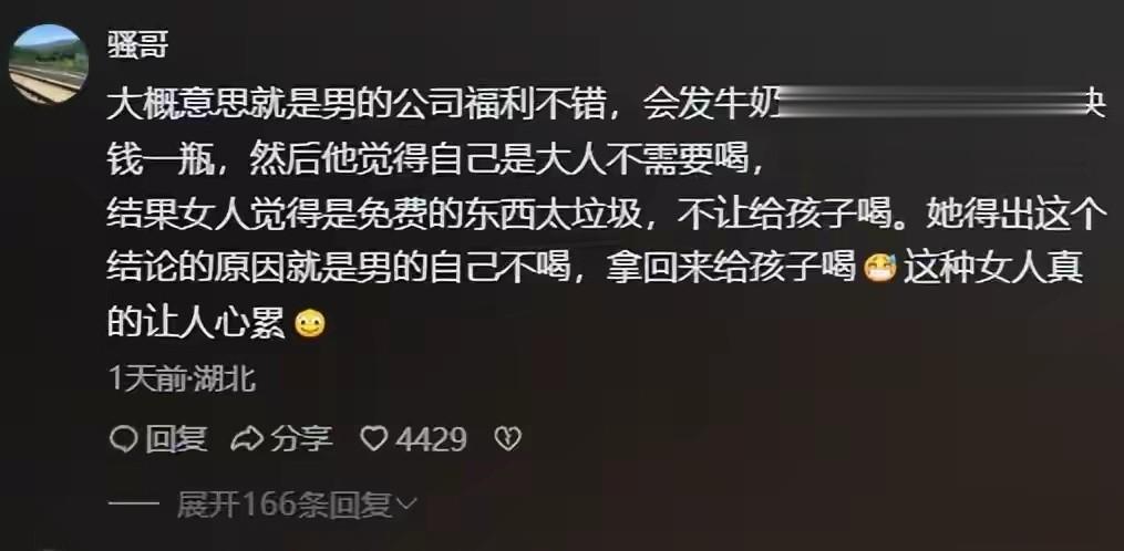 事情很简单,就是一位在华为工作、年薪四五十万的丈夫,把公司发的每瓶十几块的高端福利牛奶省下来带回家给孩子喝。