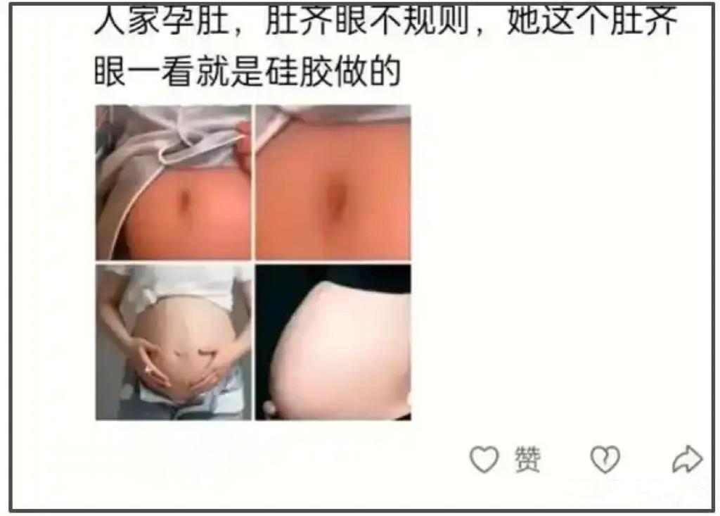 孕早期肚子小被质疑假孕,孕晚期肚子有褶皱被污蔑是假肚子,即便马筱梅公开了孕肚照,也会被揪着不放说肚脐眼不规则。