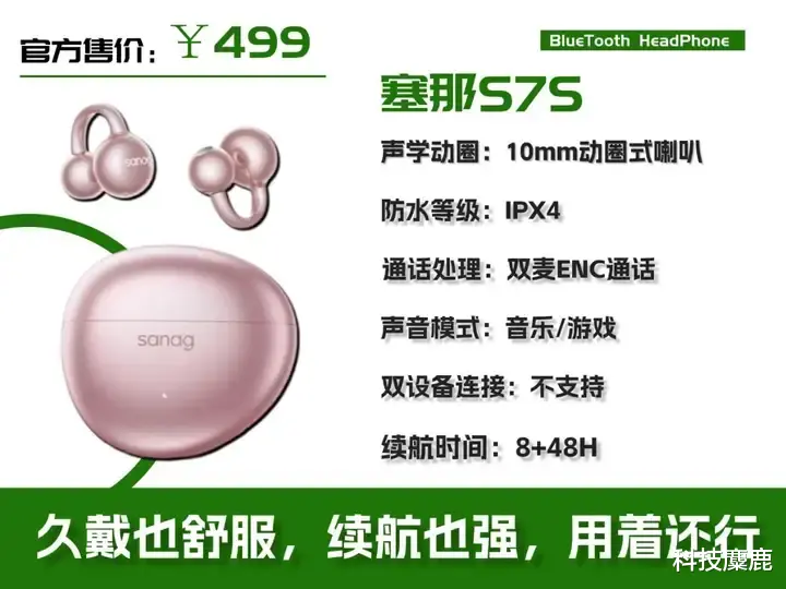 塞那 S7S 最明显的好处就是轻,单只才 4.2 克,戴在耳朵上几乎没感觉。它的空气耳骨结构设计得挺巧,既能戴稳,又不会让人觉得不舒服,就算长时间戴着听歌、上下班路上用,也不会累。