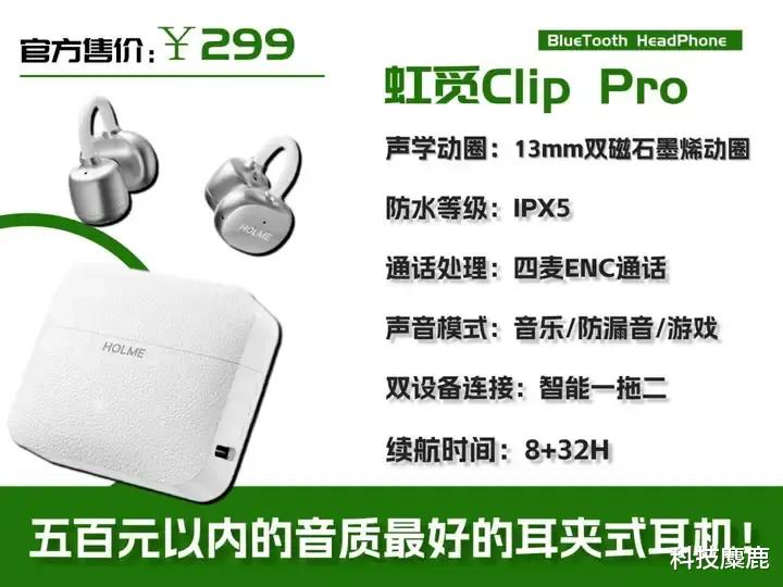 如果你预算不高又想选一款音质突出的耳夹式耳机,虹觅 Clip Pro 值得重点看看。它搭载了13mm双磁石墨烯单元,双磁设计通过两块叠加在一起的高精度磁铁,能增强磁场,让音质更饱满,音量也更足;石墨烯材料的形变能力不错,声音听着特别清晰,不会有模糊的感觉。再加上气旋式引擎腔体设计,能加大气流推力,低音效果比同价位很多耳机都要好,整体表现在同价位耳夹式耳机中称得上是天花板级别。