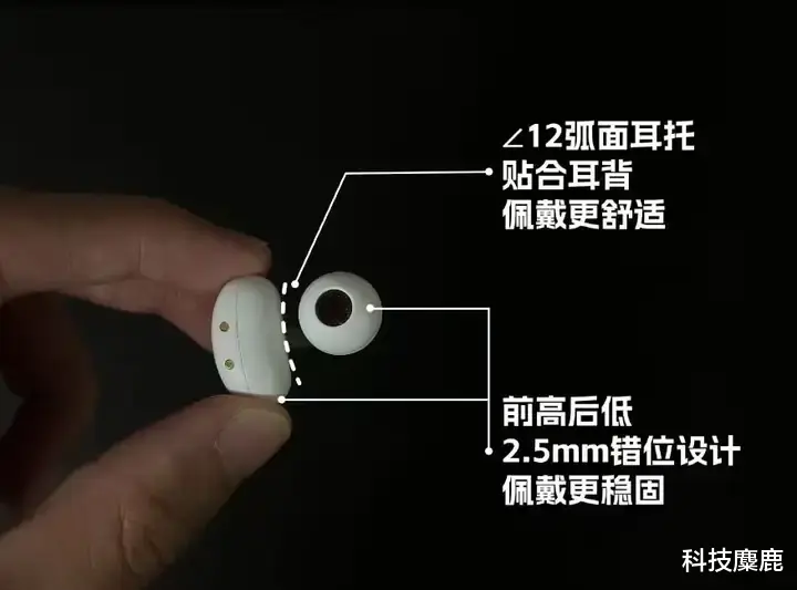 它的佩戴设计也可以,一样是2.5 毫米错位设计,前高后低的形态,往耳朵上一戴就很稳,不会晃。加上12 度弧面耳托可以很好地贴合耳朵,支撑到位还不压耳,再加上单只 4.5 克的超轻重量,就算戴一整天,耳朵也不觉得累。