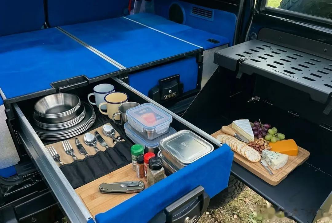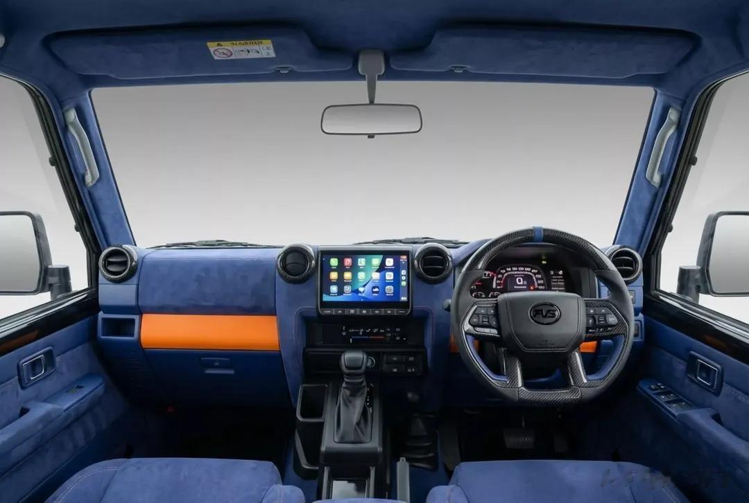 内饰变化更加大胆。座舱主体覆盖深蓝Alcantara皮料,橙色缝线点缀,搭配9英寸娱乐屏幕,储物抽屉和折叠小桌直接奔着户外露营场景去设计。座椅换成Recaro Cross Sportster GK100桶形款式,引自丰田坦途的多功能方向盘还加了碳纤维饰板,让整个驾驶体验远离朴素,几乎像科幻动画里的概念车。