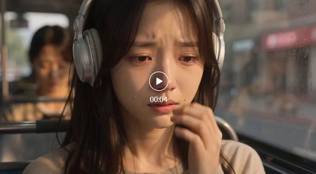 提示词:坐在公交车上的女生,戴着耳机在哭泣,要写实